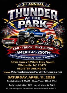 The Veterans Memorial Park of America will have their third annual Thunder at the Park car, truck, and bike show on April 11. Registration will be from 9-11 a.m. and show time from 11 a.m. – 1 p.m.