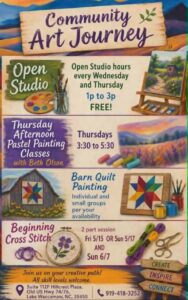 Join the Community Art Journey in Lake Waccamaw each week to create, inspire, and connect with other artists. Open studio hours are every Wednesday from 1-3 p.m., pastel painting classes are every Thursday from 3:30-5:30 p.m. with Beth Olson, and Barn Quilt painting is open to individuals and small groups per your availability.