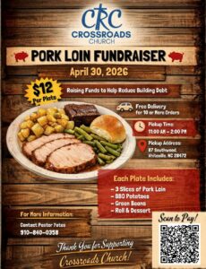 Crossroads Church will be having a pork loin fundraiser on April 30 from 11 a.m. to 2 p.m. to help support their building fund for their new facility. Plates are $12 each and include three slices of pork loin, BBQ potatoes, green beans, a roll, and dessert.
