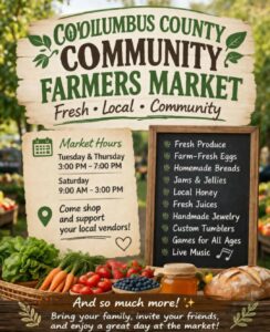 The Columbus County Community Farmers Market has new hours of operation. The facility will be open on Tuesdays and Thursdays from 3-7 p.m. and every Saturday from 9 a.m. – 3 p.m. Come shop fresh and local and support vendors and farmers in our community.