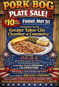 The Greater Tabor City Chamber of Commerce will be having a pork bog plate sale cooked by Chef Richard Godwin on Friday, May 1 at Ooh La La Boutique. The purpose is to raise money for the Columbus County Independence Day annual fireworks celebration at South Columbus High School.