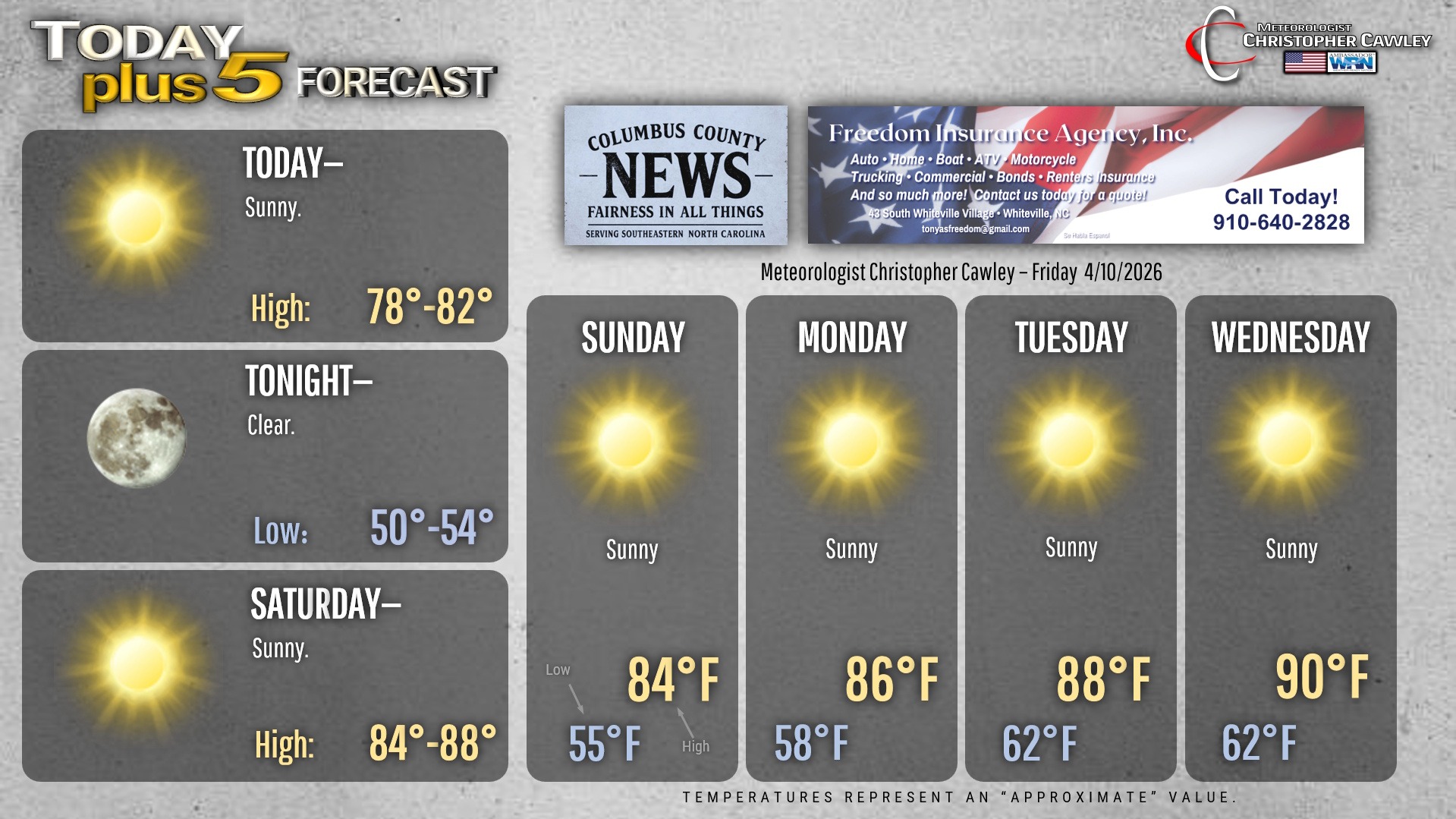 This weather update is sponsored by Freedom Insurance of Whiteville. You can trust Freedom Insurance to give you clear blue skies when it comes to home, car, boat, or whatever insurance you need. Let Freedom provide customized coverage to keep you and your family safe. Contact Freedom today at 910-640-2828!
