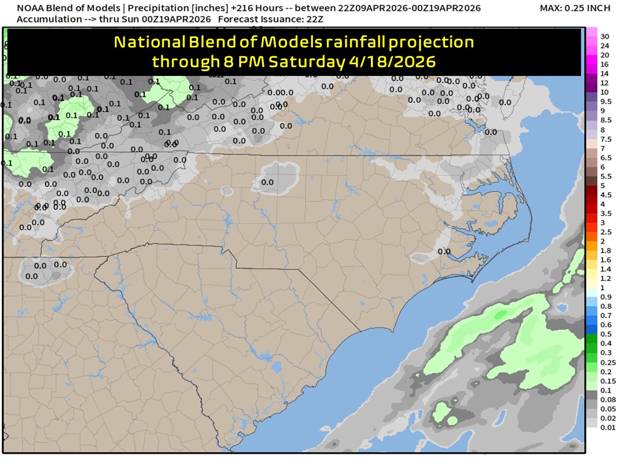 Rainfall has been almost nonexistent. We had some thunderstorms on Easter, but that was the first measured rainfall in Whiteville since March 16. And it’ll be the last measured rainfall in Whiteville until AT LEAST April 17th.