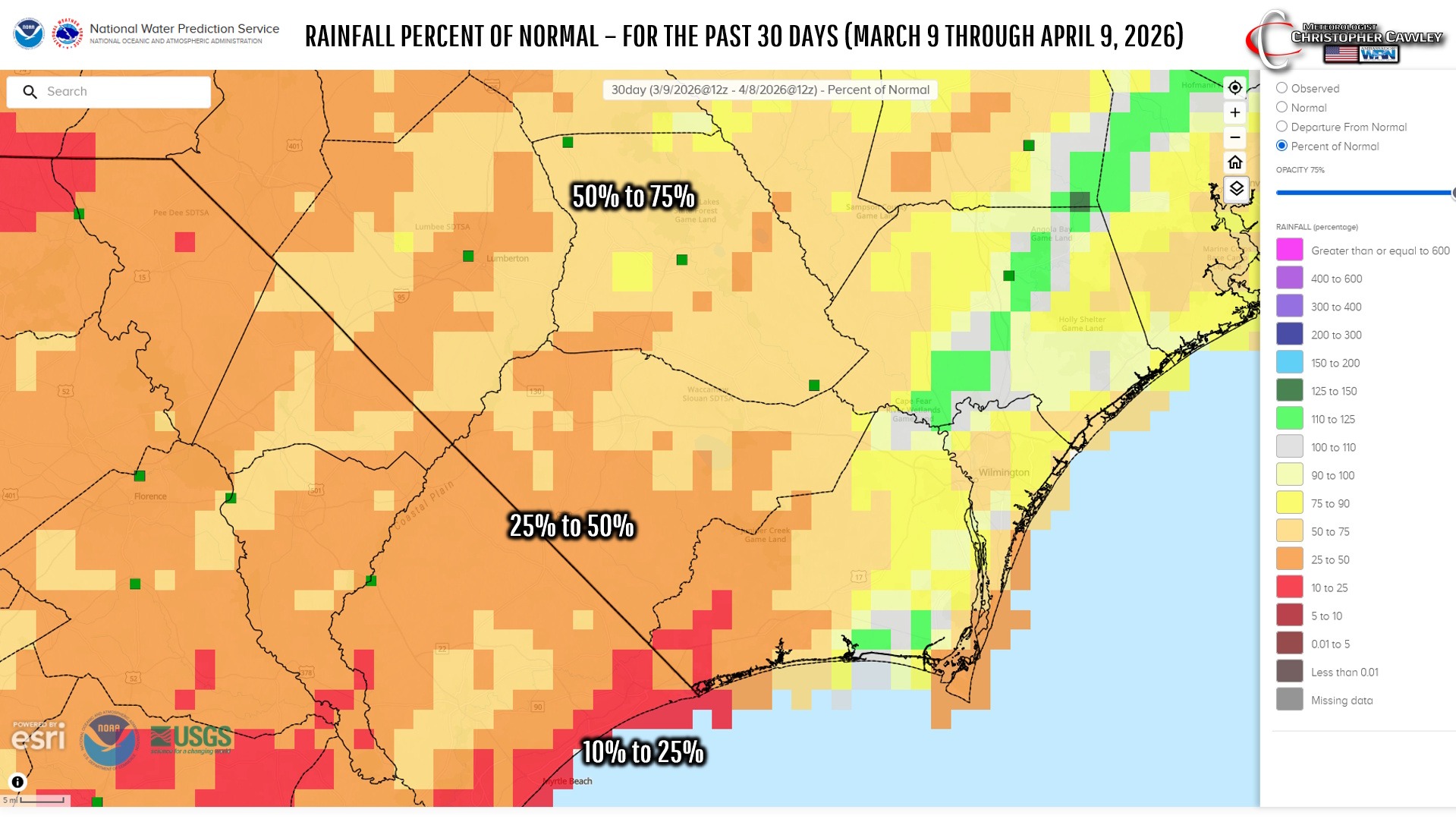 What you see here is somewhat misleading. It looks like portions of Brunswick, New Hanover, and Pender counties have had around 100% of normal… but all of that fell on Easter Sunday as that squall line went through. Take Easter away, and the results would be a lot more darker orange.