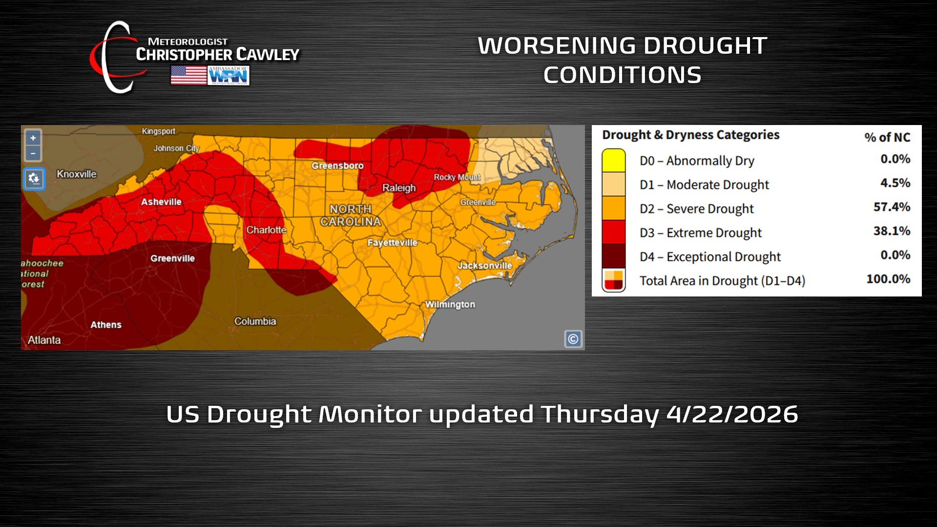 Meteorologist Tim Buckley spelled this out on FB yesterday, stating that we’re approaching drought levels that are the “worst […] in 15-20 years.”  He stated that soil moisture is dropping, and that streams and creeks continue to run quite low.  He also compared this with the droughts of 200-08, 2002, and 2016.  What sets this apart, he said, is the pace of the drought:  “The ground is drying out quickly, and without multiple, soaking rains (not just scattered showers), this will get worse.”
