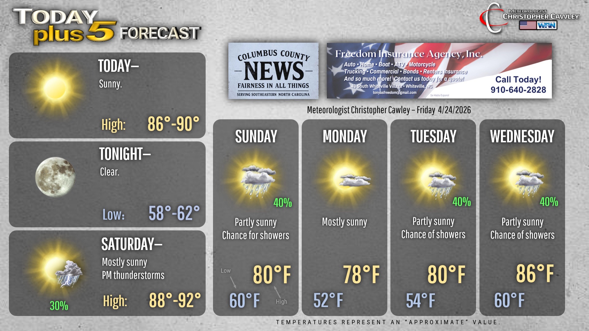 This weather update is sponsored by Freedom Insurance of Whiteville. Trust Freedom Insurance to give you clear blue skies when it comes to home, car, boat, or whatever insurance you need. Let Freedom provide customized coverage to keep you and your family safe. Contact Freedom today at 910-640-2828!