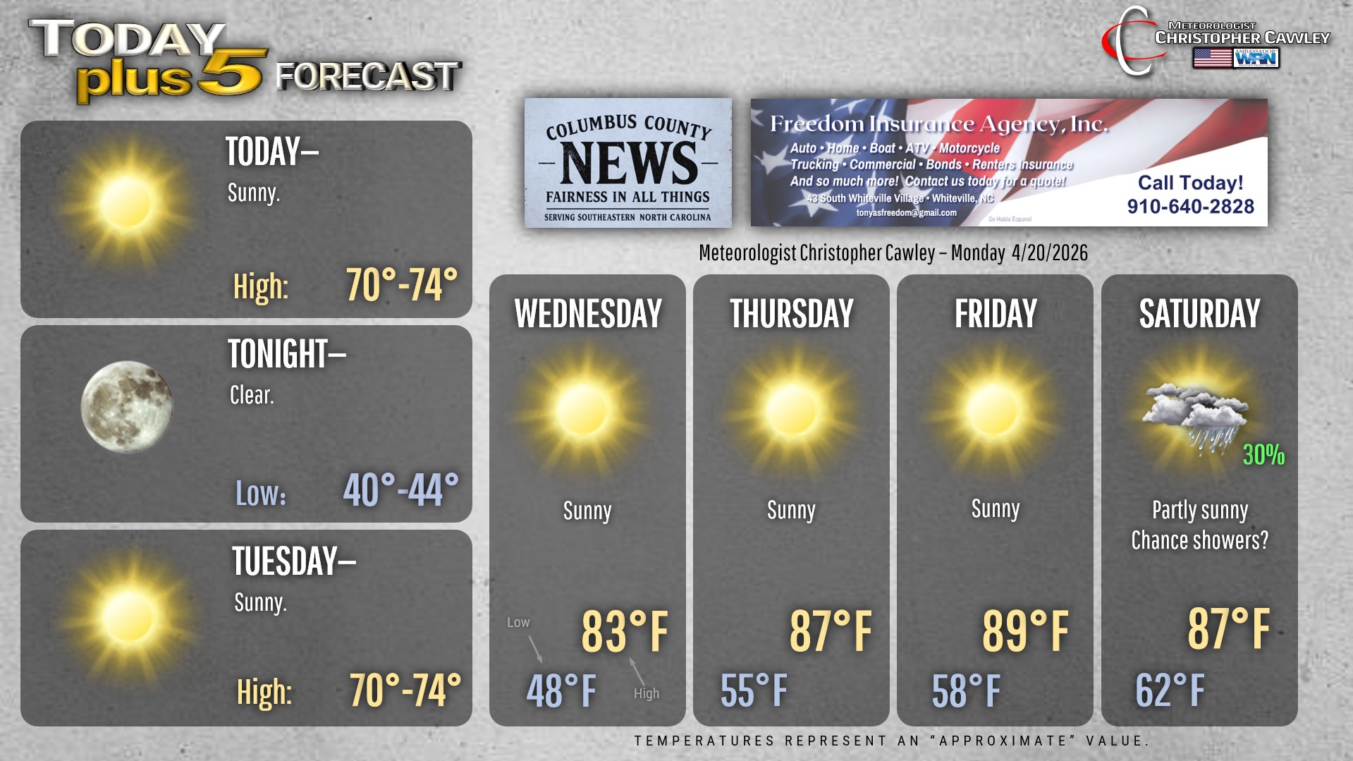 This weather update is sponsored by Freedom Insurance of Whiteville. Trust Freedom Insurance to give you clear blue skies when it comes to home, car, boat, or whatever insurance you need. Let Freedom provide customized coverage to keep you and your family safe. Contact Freedom today at 910-640-2828!