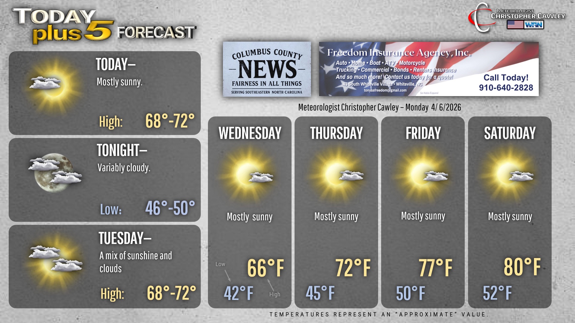 This weather update is sponsored by Freedom Insurance of Whiteville. You can trust Freedom Insurance to give you clear blue skies when it comes to home, car, boat, or whatever insurance you need. Let Freedom provide customized coverage to keep you and your family safe. Contact Freedom today at 910-640-2828!