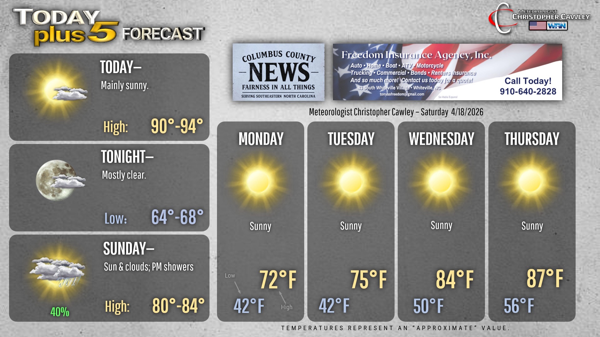 This weather update is sponsored by Freedom Insurance of Whiteville. Trust Freedom Insurance to give you clear blue skies when it comes to home, car, boat, or whatever insurance you need. Let Freedom provide customized coverage to keep you and your family safe. Contact Freedom today at 910-640-2828!