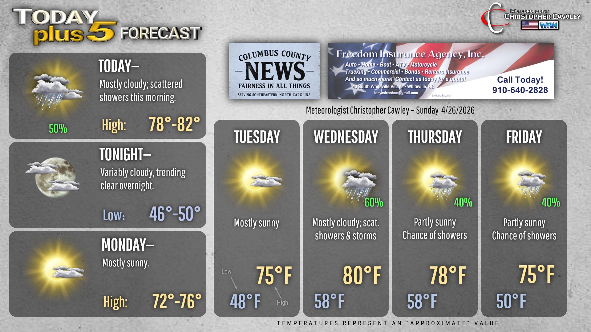 This weather update is sponsored by Freedom Insurance of Whiteville. Trust Freedom Insurance to give you clear blue skies when it comes to home, car, boat, or whatever insurance you need. Let Freedom provide customized coverage to keep you and your family safe. Contact Freedom today at 910-640-2828!