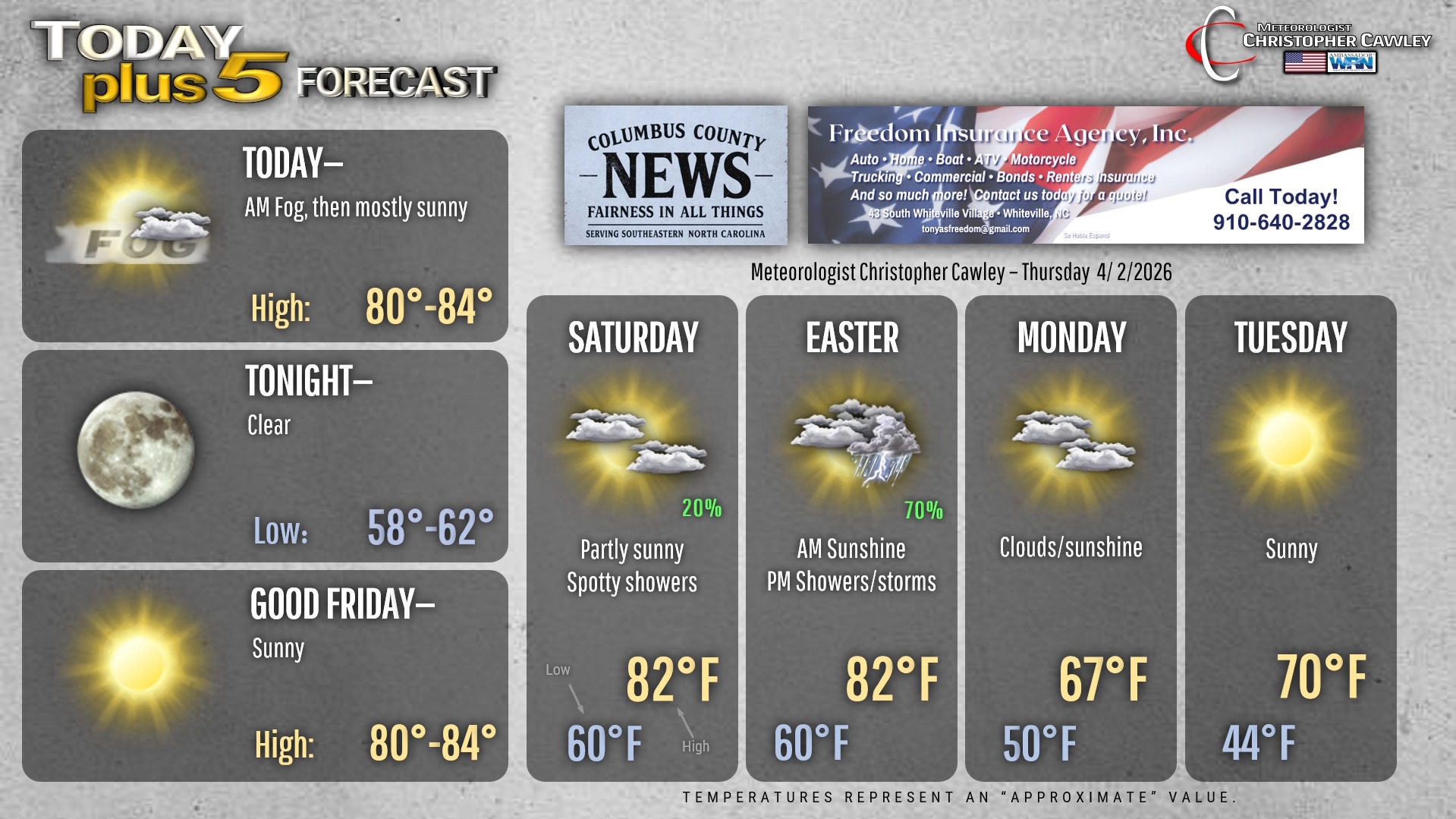 This weather update is sponsored by Freedom Insurance of Whiteville. You can trust Freedom Insurance to give you clear blue skies when it comes to home, car, boat, or whatever insurance you need. Let Freedom provide customized coverage to keep you and your family safe. Contact Freedom today at 910-640-2828!