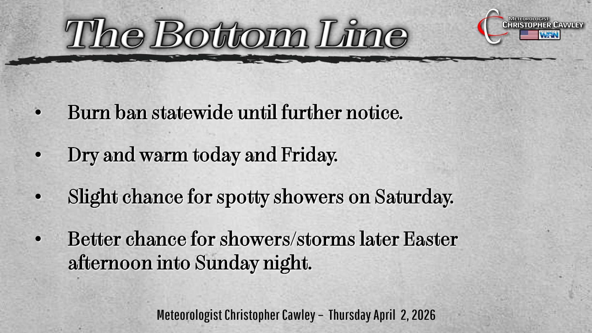 CCN Weather Update for Thursday April 2, 2026.