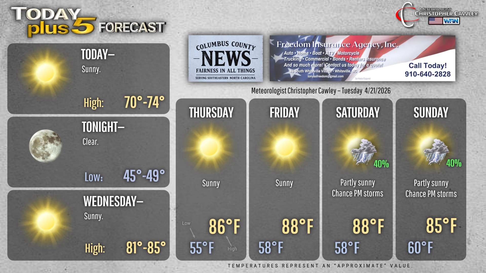 This weather update is sponsored by Freedom Insurance of Whiteville. Trust Freedom Insurance to give you clear blue skies when it comes to home, car, boat, or whatever insurance you need. Let Freedom provide customized coverage to keep you and your family safe. Contact Freedom today at 910-640-2828!