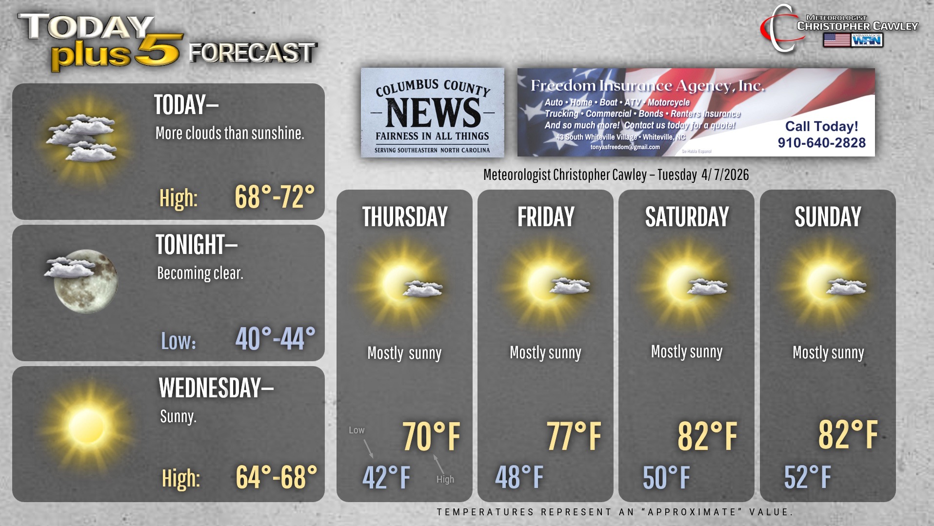 This weather update is sponsored by Freedom Insurance of Whiteville. You can trust Freedom Insurance to give you clear blue skies when it comes to home, car, boat, or whatever insurance you need. Let Freedom provide customized coverage to keep you and your family safe. Contact Freedom today at 910-640-2828!