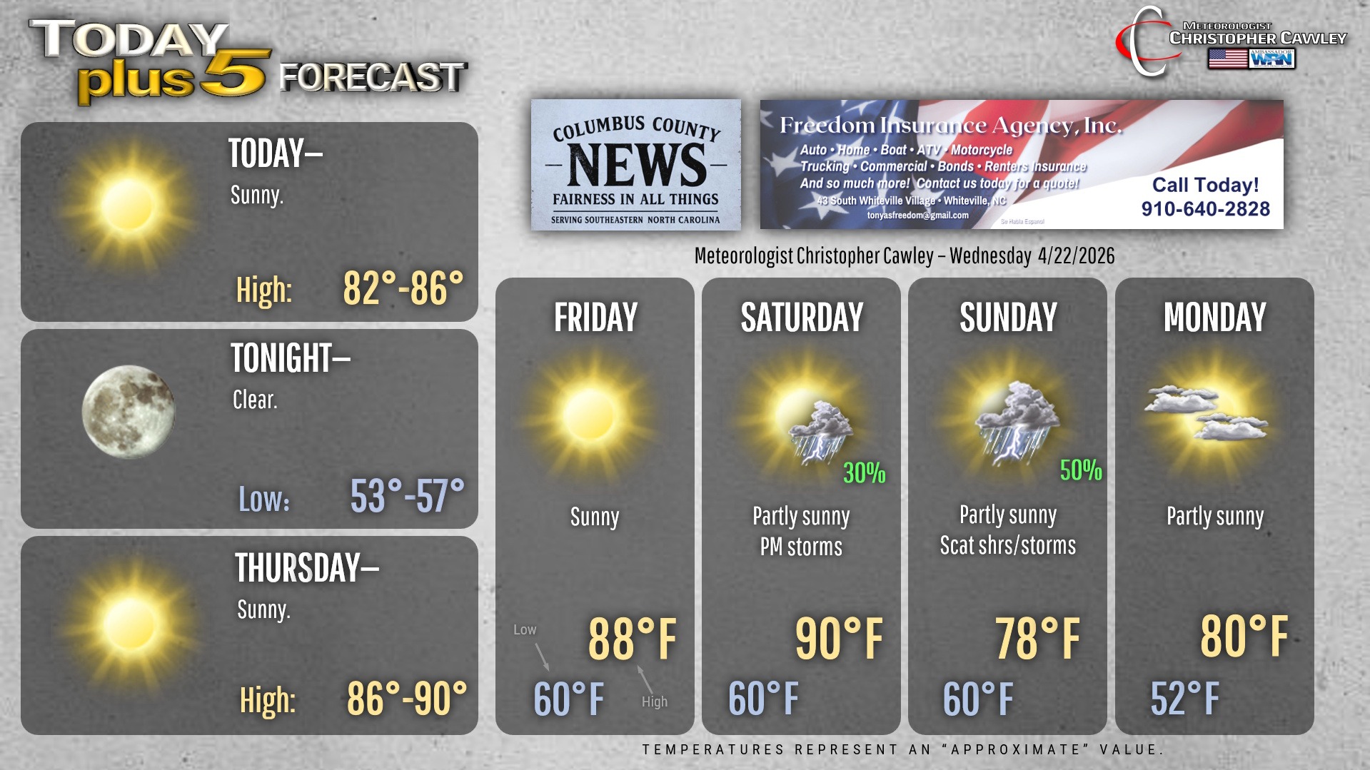 This weather update is sponsored by Freedom Insurance of Whiteville. Trust Freedom Insurance to give you clear blue skies when it comes to home, car, boat, or whatever insurance you need. Let Freedom provide customized coverage to keep you and your family safe. Contact Freedom today at 910-640-2828!