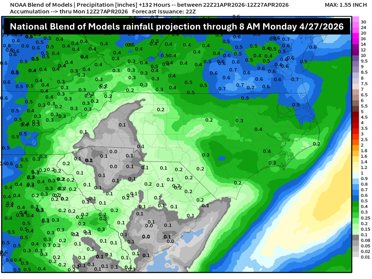 The national blend of models forecast suite still doesn’t give us a LOT of rain … about a quarter to a third of an inch. So we’re not looking at a drought-buster by any means, not even close (we need about 8-11 inches of rain for that), but at least the streak will likely end Saturday night.