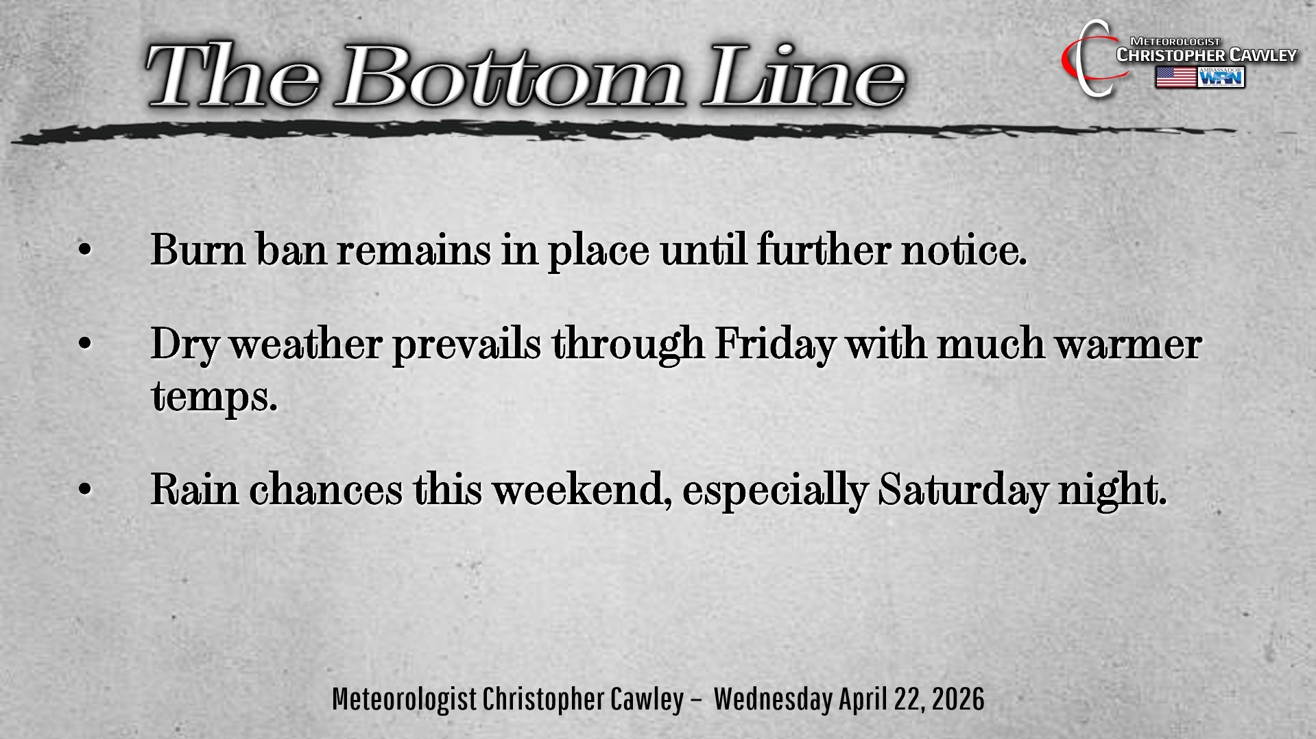 Dry weather, very low humidity, and breezy conditions will lead to a high(er) fire danger for today. Winds will be 15-25 mph at times with relative humidity values in the 25% range this afternoon.