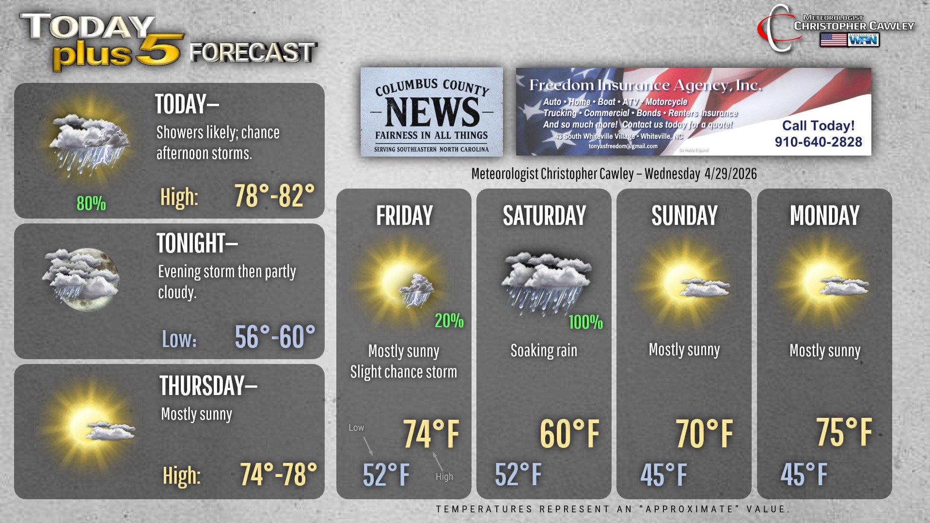 This weather update is sponsored by Freedom Insurance of Whiteville. Trust Freedom Insurance to give you clear blue skies when it comes to home, car, boat, or whatever insurance you need. Let Freedom provide customized coverage to keep you and your family safe. Contact Freedom today at 910-640-2828!