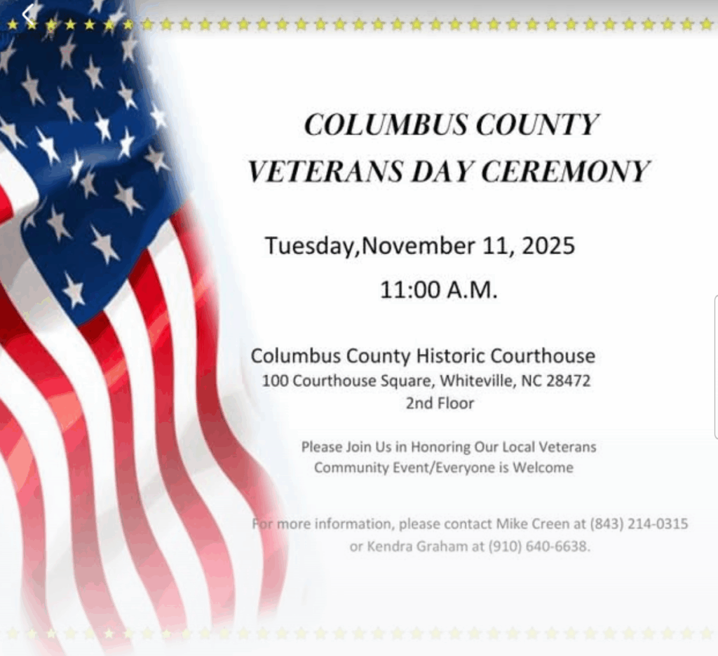 Columbus County Veterans Day Ceremony 🎖️ Join us as we honor and recognize the brave men and women who have served in the United States Armed Forces. Our Veterans Day Ceremony will be a time … Continue reading Columbus County Veterans Day Ceremony 🎖️