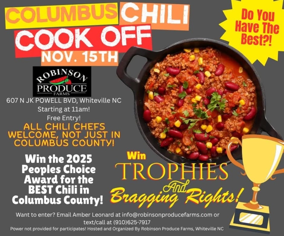 🌶 Columbus County Chili Cook-Off at Robinson Produce Farms! 📅 November 15th • Starts at 11AM 📍 Robinson Produce Farms — 607 N JK Powell Blvd, Whiteville, NC 🎟 Free Entry for Everyone! Do YOU [Read More]