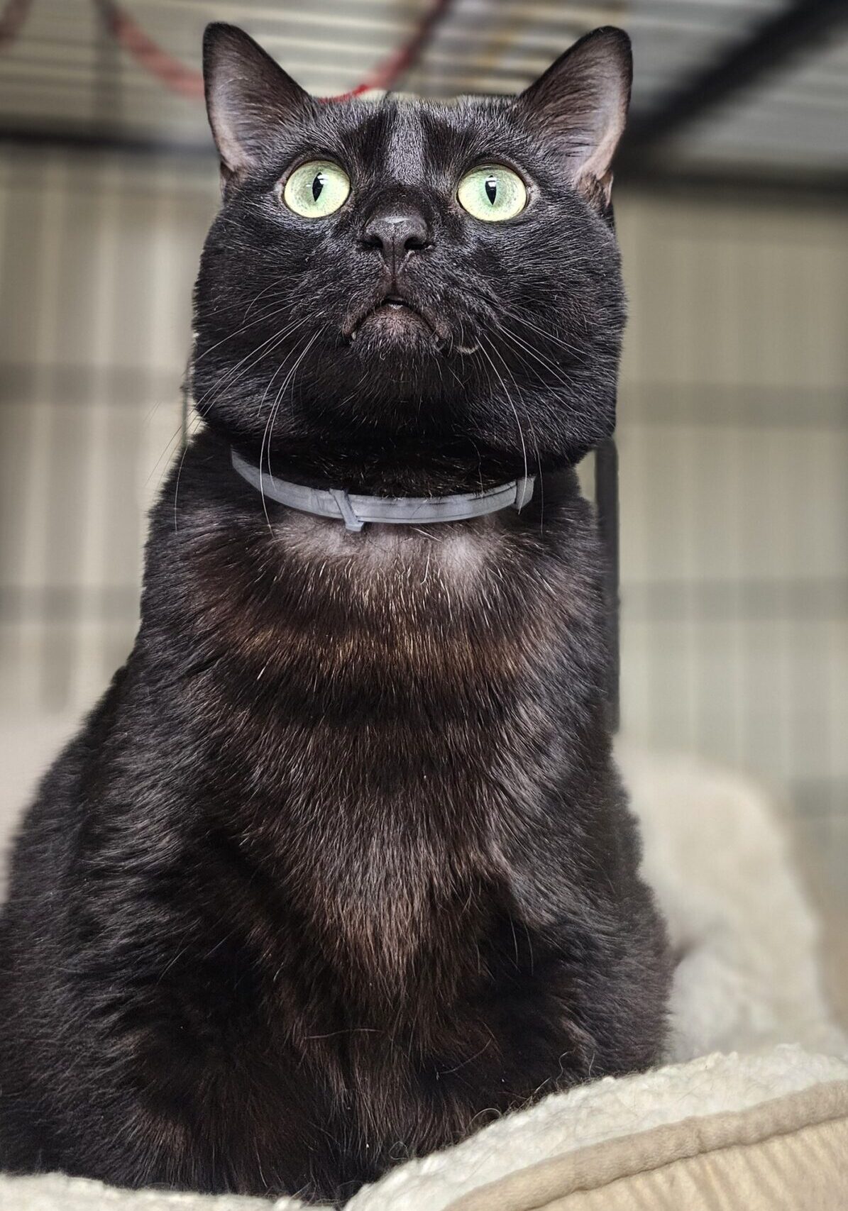 Don’t let that intense stare fool you – he’s just plotting how to fit more treats into his daily schedule. If you’re looking for a chunky cuddle buddy with the eyes of a panther and the heart of a teddy bear, and willing to adopt him forever – Toothless is your guy.Â